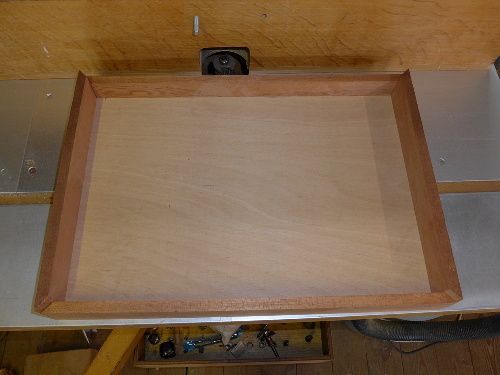 The next stage was the glue-up but I forgot to take pictures – doh! I used two new (to me) techniques. I used masking tape to stop glue leaking onto the wood in the internal corners (which would have been very difficult to clean up later) and I used masking tape wrapped around the outside of each corner to hold the mitres together – I used no clamps at all during glue up! Next time I’ll make sure I get photos.