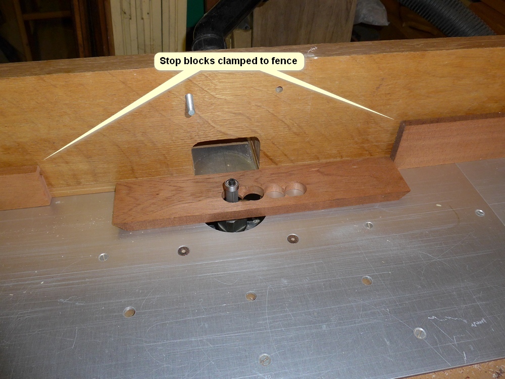 Then I used the router table to elongate the holes. I attached stop-blocks to the fence to limit the start and finish positions of the cut so that the router bit would line up with the centre of each end hole at each end of the cut. Then set the fence so that the bit was just touching the inside of the hole at the point nearest me. Then it was just a case of making sure the 12mm bit was clear of the wood before starting the router, and then moving the wood against the fence and sliding between right and left stop-blocks. Bloody hell, that’s difficult to explain in words – maybe I should start doing YouTube videos!