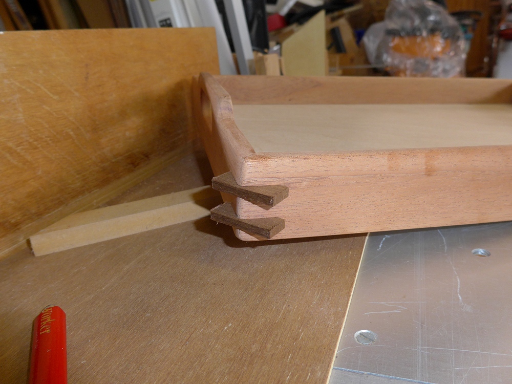 The last thing to do was to fit splines across the mitres, both as a decorative element and to substantially strengthen what would otherwise be a weak joint. This jig (that I’d made nearly thirty years ago!) held each corner of the tray at 45° while I ran it along the router table fence past a 6mm slot-cutting bit.