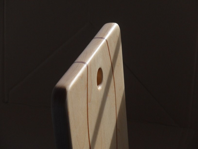 - I would rather that the three maple parts of this board had each been one piece of wood, instead of being laminated from different pieces. I don’t like laminated wood in general (don’t get me started on supposedly ‘solid wood’ furniture). On this bread board some of the grain patterns almost matched up – that was purely by coincidence. In other places you can see small slithers of the adjoining board where it’s been cut off by the wavy mahogany.