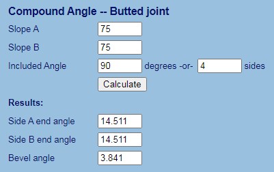The sides and ends of the basket slope outwards, away from the vertical by 15°. So that is 75° from horizontal. Compound-angle joints are not as straightforward as you might think, and are quite tricky to visualise in your mind’s eye. Luckily there are online calculators to help with the maths. I used one found here, and inserted my requirements into the relevant fields ⤵